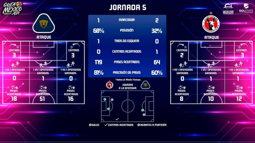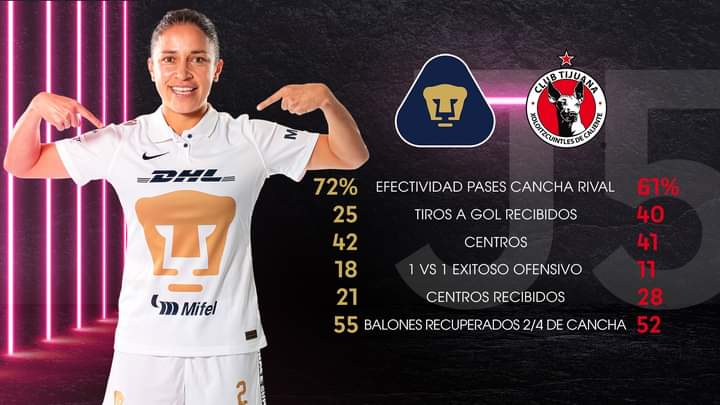Las Pumas han aprendido en estas 4 jornadas pasadas que no se deben de confiar, ya que para el minuto 25 Renae Cuellar se volvía a hacer con el balón y acertaba el segundo tanto por parte de las Xolas. En la parte final del primer tiempo el arbitro señalo un penal a favor de las felinas el cual lo fallaron.