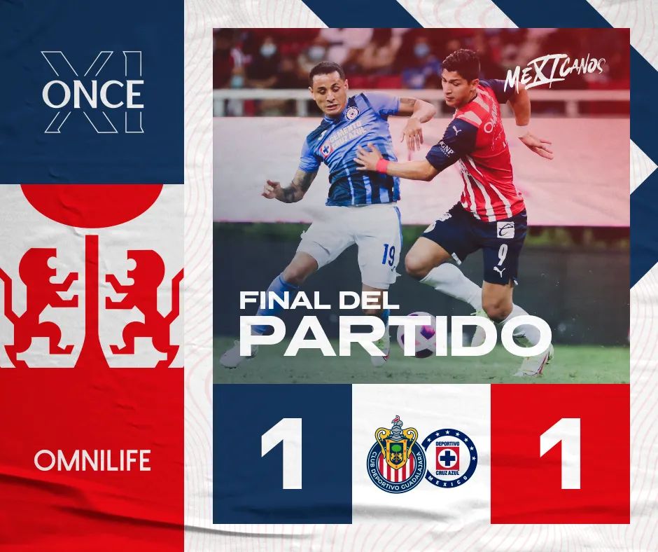 Esta noche en la ya jornada 15 de este Apertura le tocó ver el Chivas contra la máquina de la cruz azul en un partido donde ambos equipos tuvieron oportunidades sin embargo no se concreta ningún gol hasta que llegó casi el final de la primera parte y con una jugada muy polémica incluso revisandola en cámara lenta sigue siendo dudos pero que al final el central decidió marcar como pena máxima y así el «Cabecita» abriría el marcador e irse a los vestuarios del medio tiempo con la victoria., para el segundo tiempo siguieron intentando sellar la victoria que a ambos equipos le ayudaría obtener los tres puntos pero no fue así solo al minuto 90+4′ donde el jugador chivista puso el empate definitivo del encuentro con este empate de a las Chivas en noveno lugar con 19 puntos a dos fechas de terminar el torneo regular. 🔥🚂⚽️🐏👑