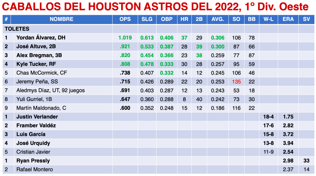 Astros terminó la campaña regular con CUATRO caballos por arriba del .800 de OPS (Yordan Álvarez, José Altuve, Alex Bregman y Kyle Tucker) y sólo dos por encima del .300 de average (Álvarez y Altuve). Sus pitchers registraron 2.90 de efectividad.