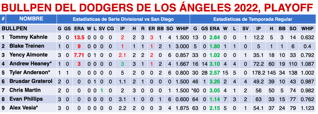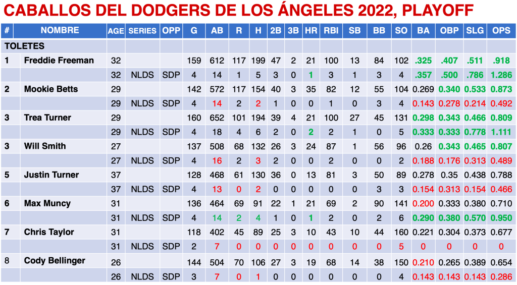 El Dodgers en la Serie Divisional tuvieron tres toletes por encima del .800 de OPS, Freddie Freeman, Trea Turner y Max Muncy;  sólo dos por arriba del .300 de AVG, Freeman y Turner, Muncy un poco abajo con .286. Dodgers terminó con 3.71 de ERA en los playoff.