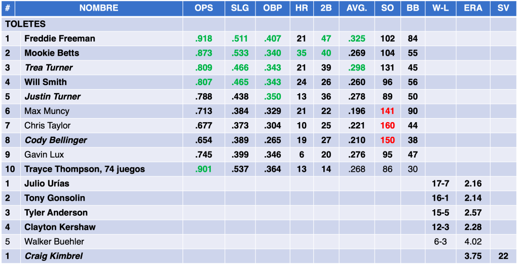 Dodgers tuvo CINCO caballos estuvieron por encima del .800 de OPS (Freddie Freeman, Mookie Betts, Trea Turner, Will Smith, Justin Turner y Trayce Thompson con sólo 74 juegos); aunque sólo Freddie Freeman por encima del .300 de porcentaje de bateo (.325 de AVG) y Trea Turner con .298. En efectividad, todo su departamento de pitcheo promedió 2.80