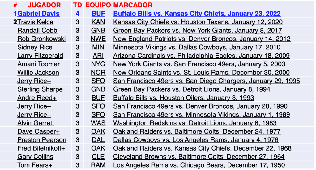 La anterior marca tenía múltiple empate a tres touchdowns. A continuación la lista completa de aquellos receptores que lograron tres touchdowns en un solo juego de playoff y donde el rey hoy por hoy es Gabriel Davis de 22 años, egresado de la universidad de Central Florida y que fue reclutado por los Bills de Buffalo en el draft del 2020 en la cuarta ronda.