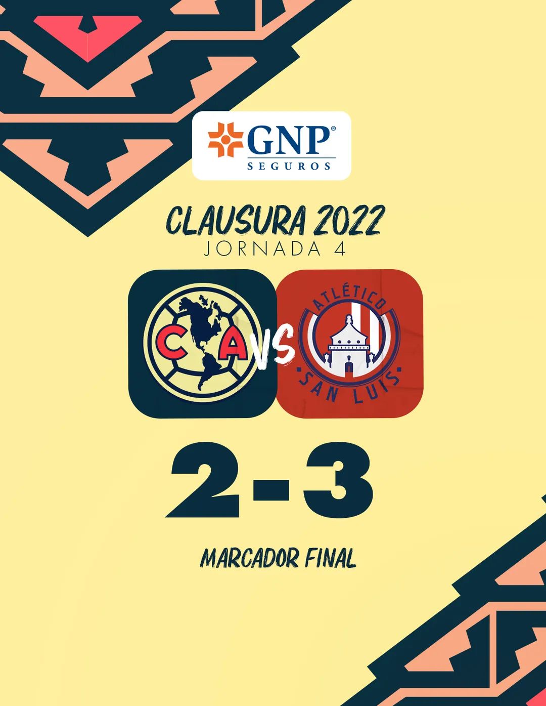 America vs Atlético de San Luis: 3-2 goles de San Luis U. Bilbao 6′, A. Hernández 54′, G. Berterame 61′,. Goles America: R. Martínez 90′, H. Martín 90+4′, M. Layun expulsado 85′. Estadio azteca, jornada 4 Clausura.