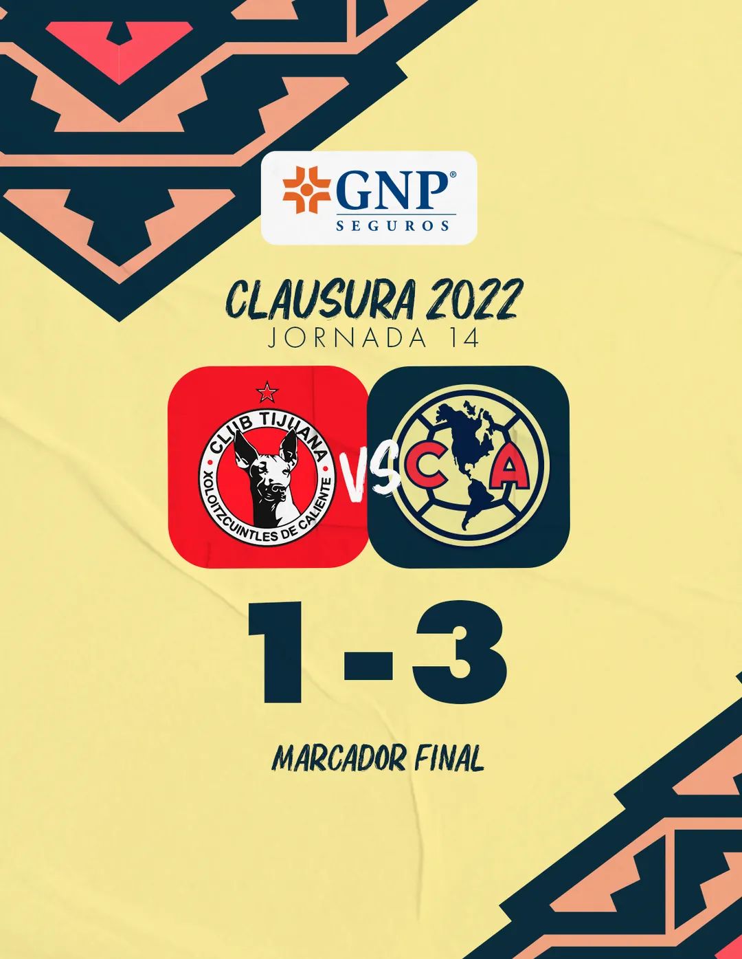 Tijuana 1-3 América, estadio Caliente, Clausura 2022 jornada 14. Gol de tijuana J. Montesinos 31′, Goles del América: R. Martínez 7′, A. Zendejas 10′, A. FIdalgo 84′ (P)