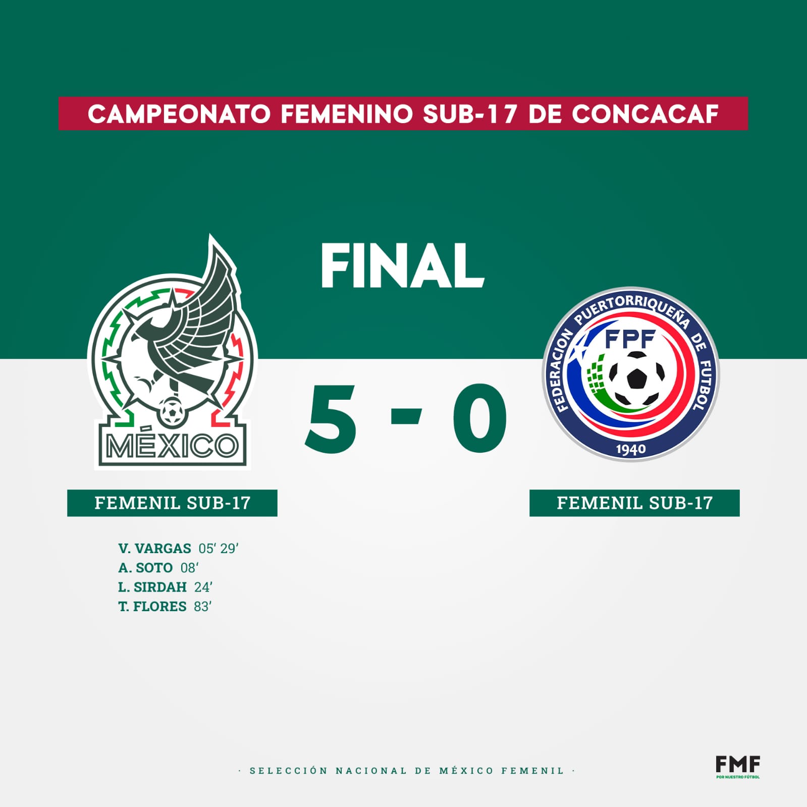 La selección femenil de México venció a su similar de Puerto Rico por un marcador de 5-0 en el campeonato femenino sub 17 de concacaf para así pasar a la gran final y ya consiguiendo su boleto para el próximo Mundial en la India