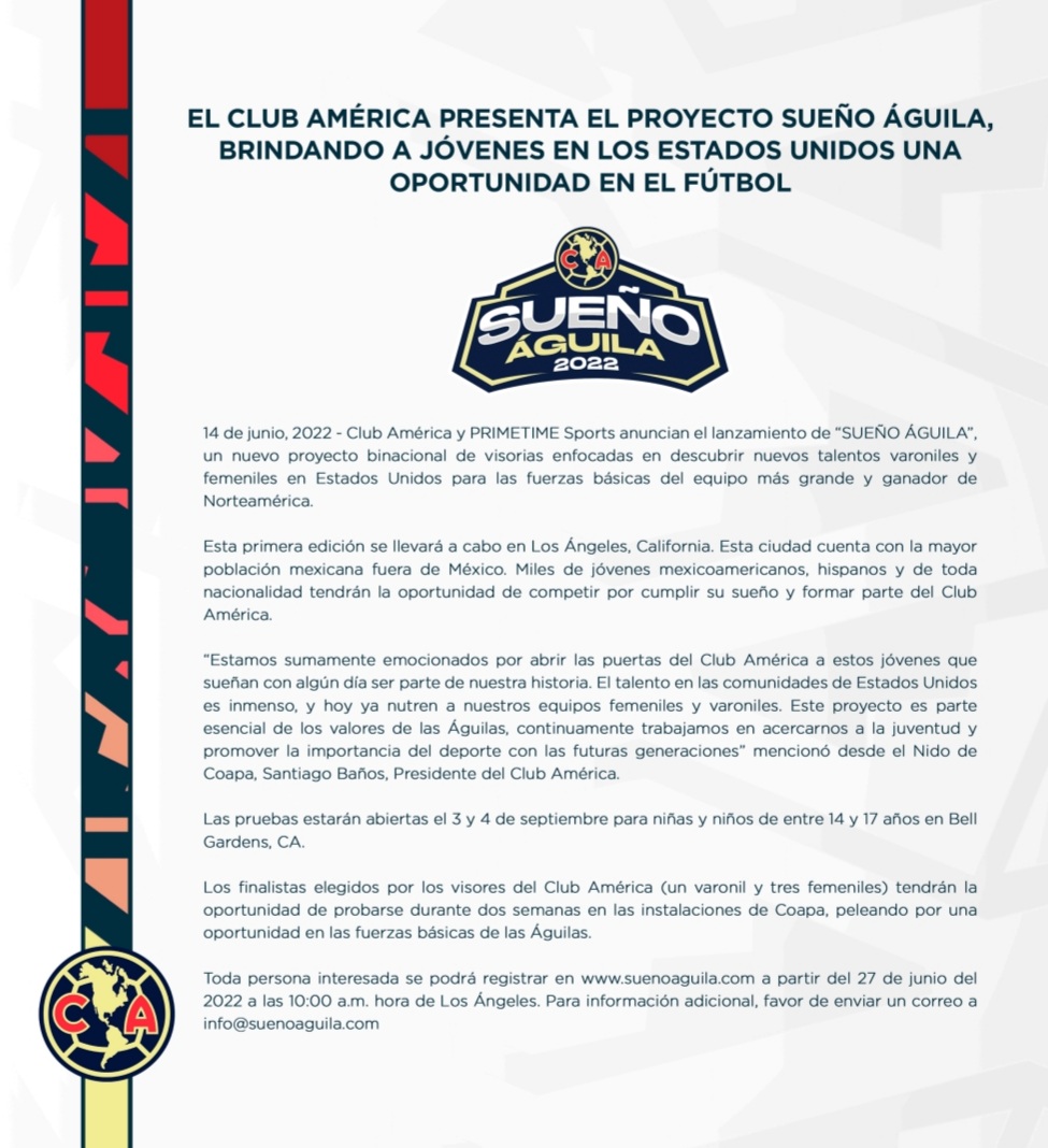 Club América se enorgullece en anunciar #SueñoÁguila, una plataforma de visorías para encontrar a la siguiente estrella americanista en los Estados Unidos. 🇺🇸🦅🧒