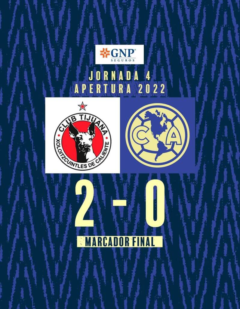 Apertura 2022, jornada 4 Tijuana 2-0 América, estadio Caliente goles: L. López 9′ (penal), J. Montesinos 62′
