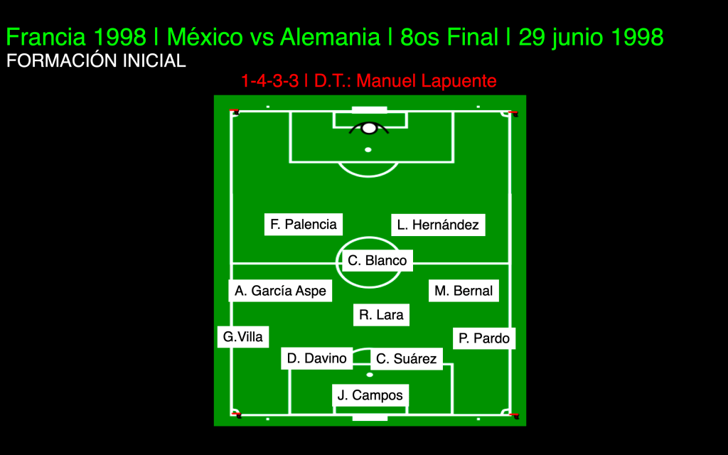 El Tricolor mostró un parado táctico de 1-4-3-3, mismo que usó en ese mismo Mundial contra Corea del Sur en el primer tiempo, alineó con el “Inmortal” 1-Jorge Campos como el cancerbero nacional, 31 años; el lateral derecho fue 13-Pavel Pardo, 21 años y el izquierdo 4-Germán Villa, 25 años, los centrales 5-Duilio Davino, 22 años y 2-Claudio Suárez, 29 años; el contención 14-Raúl Rodrigo Lara, 25 años, como interior derecho 6-Marcelino Bernal, 36 años (Salvador Carmona, ´46, 22 años) y el interior por izquierda 8-Alberto García Aspe, 31 años (9-Ricardo Peláez, ´86, 34 años); adelante, por izquierda 11-Cuauhtémoc Blanco, por derecha, 25 años, 17-Francisco Palencia, 25 años (Jesús Arellano, ´53, 25 años) y 15-Luis Hernández como centro delantero, 29 años. D.T. Manuel Lapuente.