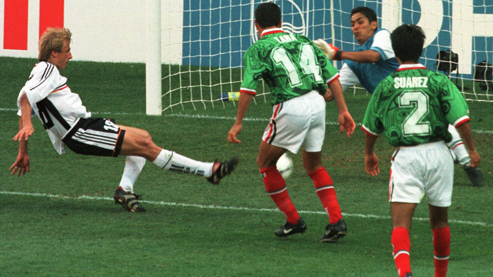 Así fue, en el minuto 74 de tiempo corrido, nuevamente el contención 16-Hamann, desde la lateral derecha en tres cuartos de cancha, enviaba un servicio largo por elevación al sector central del área del equipo mexicano, aparecían con las referencias de marca correctas 2-Suárez con 20-Bierhoff y 14-Raúl Rodrigo Lara con 18-Klinsmann, el esférico techó a Suárez y a Bierhoff, pero al tratar de fildearlo o despejarlo, a Lara, la pelota se le coló entre las piernas, el balón cayó al centro y en el límite del área chica, donde la pierna de Juergen Klinsmann apareció primero que la de Jorge Campos para empujar la número cinco en la red de la portería mexicana, se decretaba el 1-1 en el marcador.