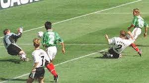 Para el minuto 85, 21-Michael Tarnat recibía, en el último tercio de su zona ofensiva, un cambio de juego enviado desde la altura de los tres cuartos de cancha, controlaba y a su vez mandaba otro cambio de orientación con la zurda y con dirección al vértice derecho del área mexicana, ahí recibía de espaldas con la izquierda 9-Ulf Kirsten quien de inmediato se la acomodaba, se perfilaba y enviaba el centro justo al manchón penal donde 20-Olivier Bierhoff saltaba vehemente entre dos defensas mexicanos, ante la tibia marca de 14-Raúl Lara y la mirada expectante de 5-Duilio Davino quien se encontraba por delante, remataba seco al ángulo superior izquierdo del arco del nativo de Acapulco, Guerrero, quien nada podía hacer para evitar la caída de su marco; se sentenciaba el 2-1 a favor de los “Die Maschine” (La Maquinaria), al mismo tiempo que se esfumaba el segundo intento consecutivo por llegar a los cuartos de final, después que en Estados Unidos ´94 México había sucumbido contra Bulgaria en la tanda de penales; en ésta ocasión había sido el juego aéreo la llave en que Alemania pudo superar y abrir el cerrojo del cuadro mexicano.