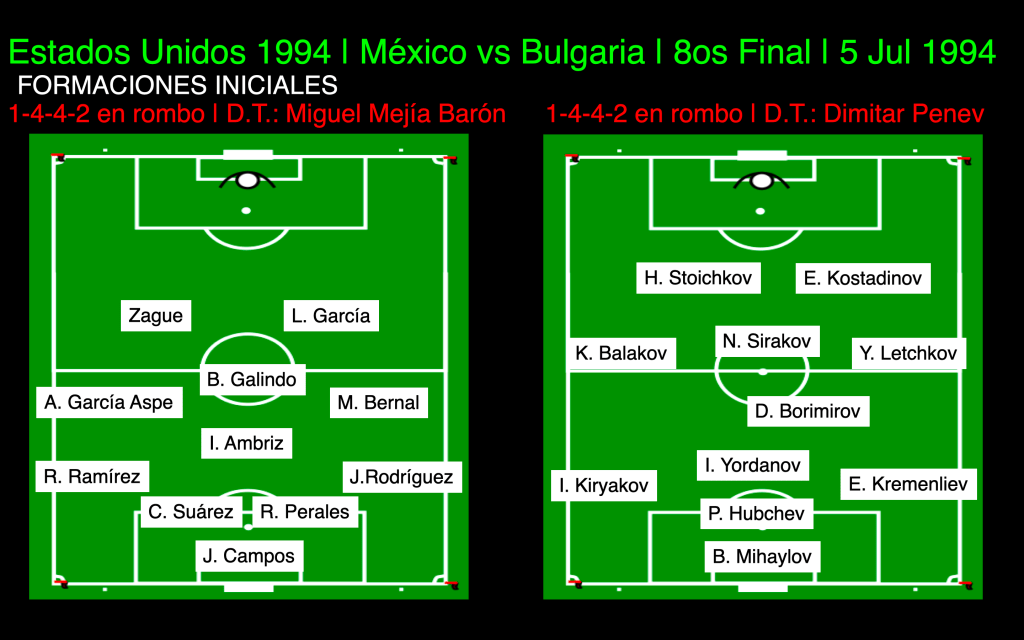 8-Hristo Stoichkov vacunó al tricolor bien temprano, el 1-0 se presentó en el minuto seis, a través de una transición defensa-ataque, en una contra, un regate que inicia en el último cuarto de Bulgaria y se viene un latigazo raso de 13-Ivaylo Yordanov, lanzado desde el círculo central y al espacio por el costado izquierdo, Stoichkov al entar al área condujo sólo unos metros y fulminó a Campos con un cañonazo de zurda al ángulo superior derecho del mexicano, imparable.