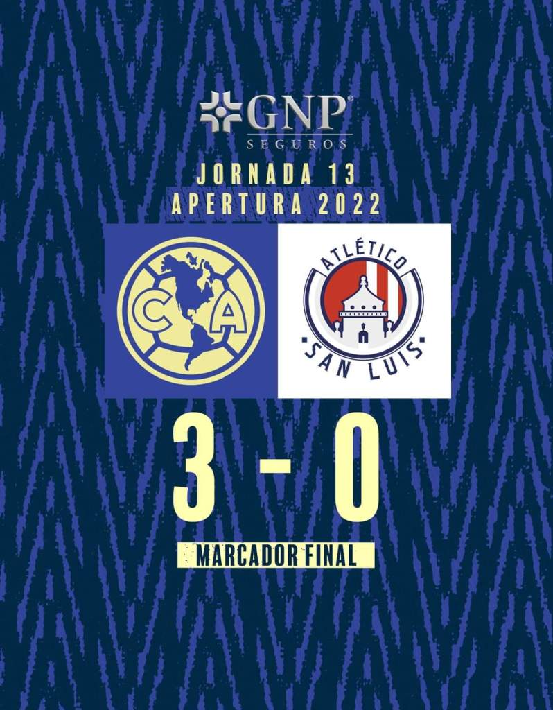 Jornada 13 Apertura 2022 América 3-0 San Luis Estadio Azteca Goles: J. Rodríguez 45′, D. Valdez 54′ H. Martín 56′.