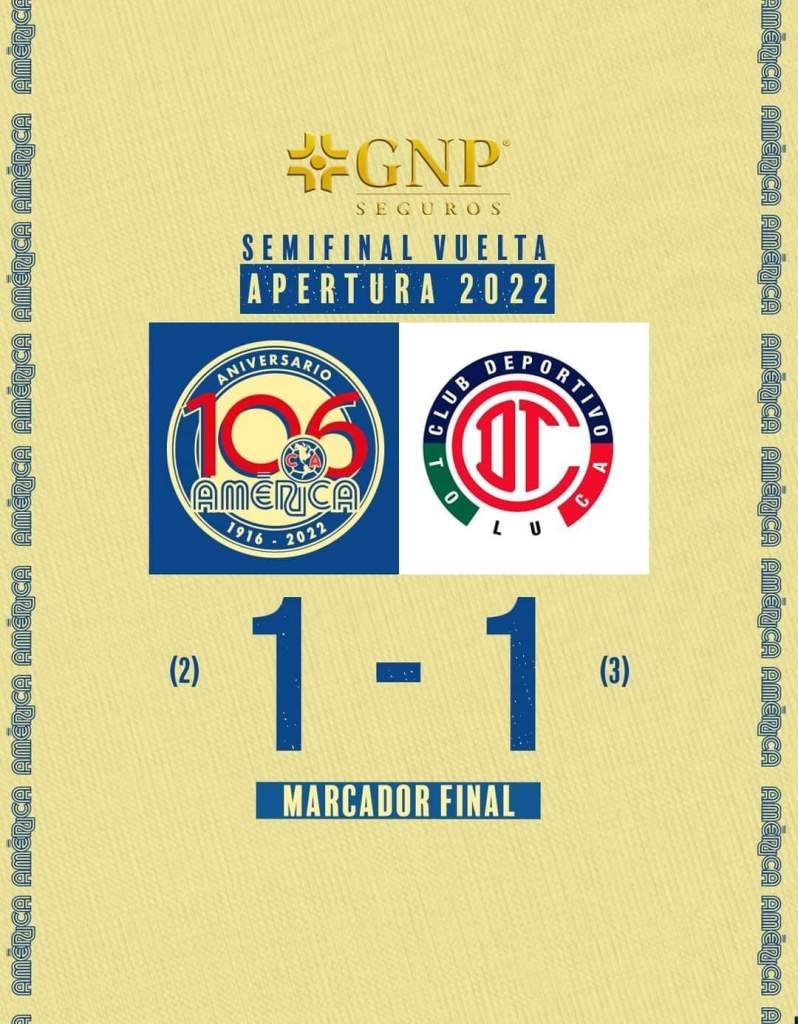Semifinal vuelta América (2)1-1(3) Toluca Estadio azteca gol del América A. Zendejas 35′., Gol del Toluca J. Torres 29′