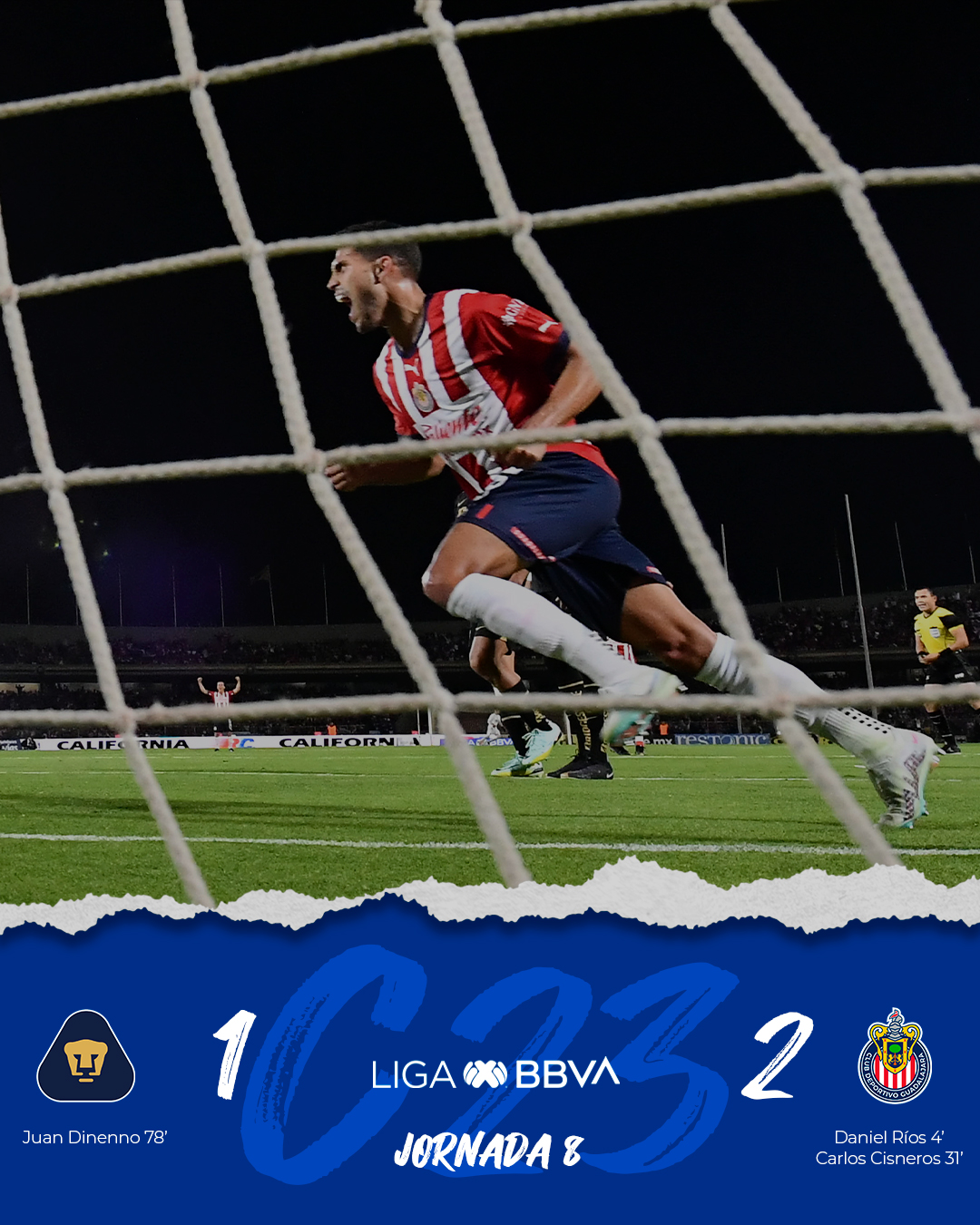 Tras tres intentos de Pumas por empatar el marcador llegaba Carlos Cisneros con un remate dentro del área para adelantar otro tanto a Chivas 0-2.