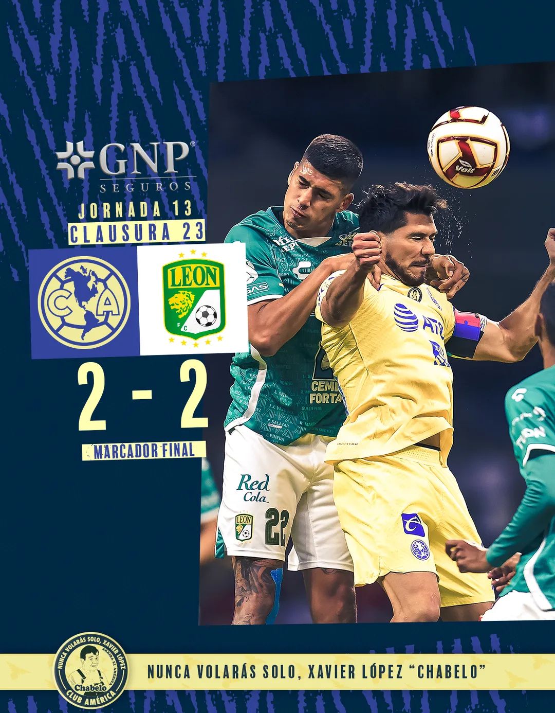 Jornada 13 clausura 2023 Estadio Azteca América 2-2 León goles américa: D. Valdez 63′, H. Martin 68′. Goles León: A. Alvarado 45+2′, J. Cambell 90+4′.