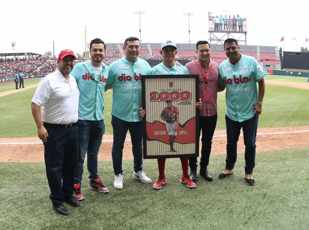 En la sexta entrada en una ceremonia rápida y emotiva se le entrego a Arturo López un reconocimiento por sus 1,000 innings lanzados en LMB.