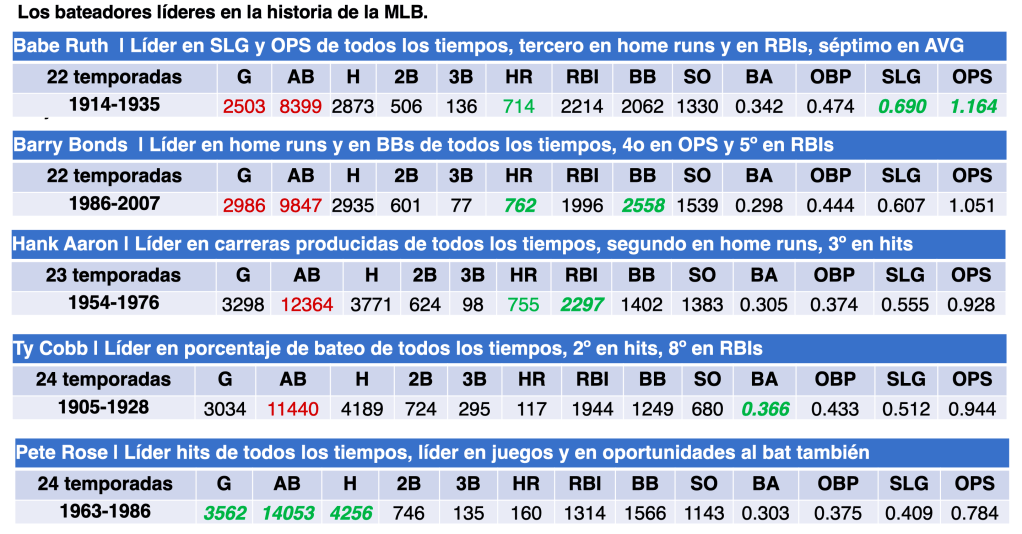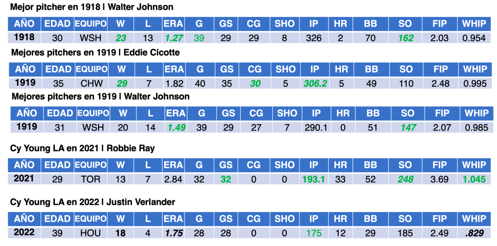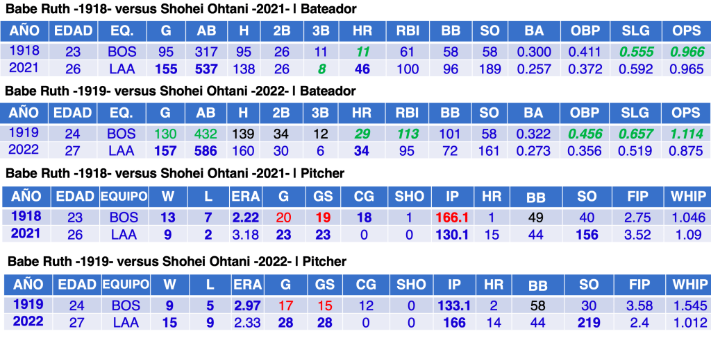 Incluímos las estadísticas de los mejores pitchers y bateadores de 1918, 1919, 2021 y 2022 para comparar las estadísticas de Ruth y Ohtani con los ganadores del trofeo Cy Young de la Liga Americana en 2021 y 2022, así como los ganadores del pelotero más valioso (MVP) de la Liga Americana en 2021 y 2022 también. En 1918 y 1919 no se entregaba aún el trofeo Cy Young y tampoco hubo trofeo para el MVP, por lo que consideré los números de los mejores bateadores en dichos años, que de hecho en 1919 Ruth fue el mejor tolete y en 2021 Ohtani fue el MVP, simplemente lo que confirma la grandeza de ambos.