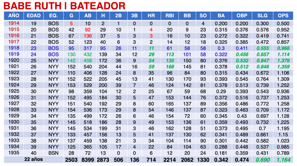Conclusión: salvo las diferencias en el número de salidas, que fueron más las del nipón, pero al considerar que en la época del ”Bambino” pitchers solían completar más juegos, los números tanto de bateo como de pitcheo son similares y respetables en ambos a pesar de haber más de 100 años de diferencia entre una y otra época.