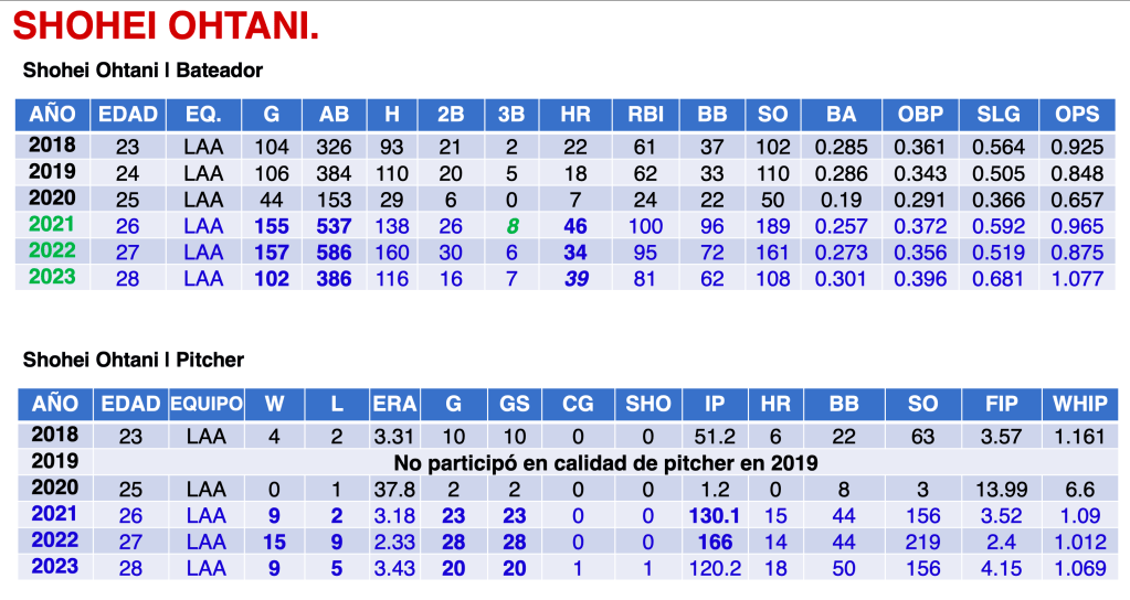 Al cierre del 28 de julio del 2023, observemos en la tabla los números de Ohtani, 39 palos de vuelta entera con 1.077 de OPS; 9 ganados y 5 perdidos con 3.43 de ERA y ya una blanqueada y un juego completo de un solo hit en su última salida contra los Detroit Tigers, además conectó dos macanazos de cuatro esquinas en ese último juego.
