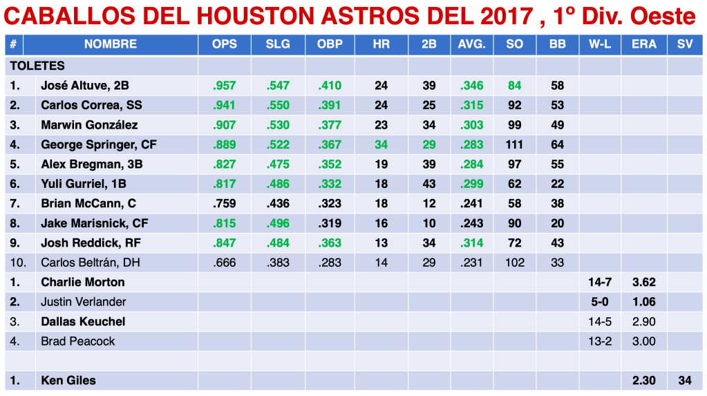 En lo que respecta al bateo, observemos en la tabla que durante la temporada regular terminaron con ocho bateadores por encima del .800 de OPS, de los cuales, cuatro con un promedio de bateo por arriba de .300 y tres muy cercano al .300; sin embargo, insistimos, en una temporada donde robaron señales y los principales beneficiados fueron sus bateadores.