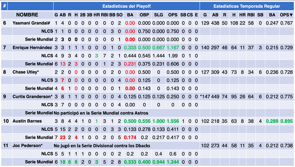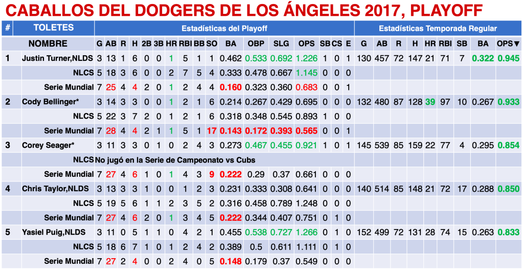 Aquellos toletes de la temporada regular desaparecieron casi por completo, excepto Joc Pederson con 3HR, .333 de average y 1.344 de OPS, todos los demás caballos que vieron más acción, tuvieron números muy pobres, incluso por debajo del .250 de average, penoso, frustrante la falta de bateo de los Dodgers. Con buenos números, pero con pocos turnos al bat, Charlie Culberson, Andre Ethier, no pudieron apoyar lo suficiente. El único que estuvo más cerca del .300 de average fue Logan Forsythe, quien jugó la segunda base y tuvo 18 oportunidad al bat. Un desastre la ofensiva del manager Dave Roberts, por ejemplo, Yasmani Grandal y Chase Utley tuvieron .000 de average, cero hits, difícil de creer.
