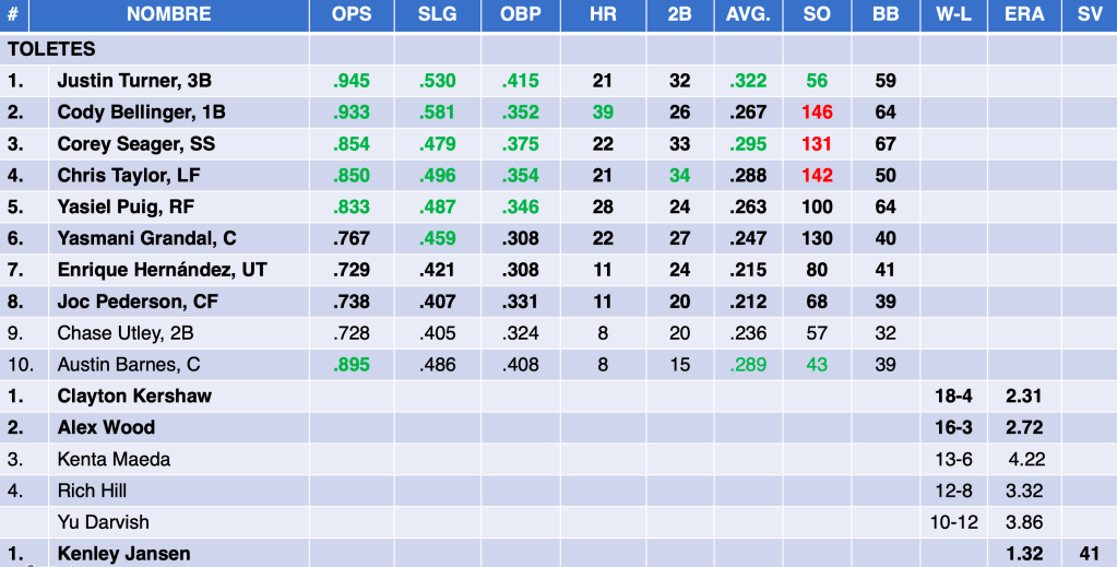 Tuvieron seis caballos con un OPS arriba de .800 (Justin Turner, Cody Bellinger, Corey Seager, Chris Taylor, Yasiel Puig y Ausin Barnes), pero sólo a Turner por arriba de .300 de average, Seager y Barnes cerca de .300. En relación al pitcheo, fueron dos grandes exponentes abridores en los nombres de Clayton Kershaw con 2.31 de ERA con 18-4 y Alex Wood con 2.72 de ERA y 16-3 en ganados y perdidos.