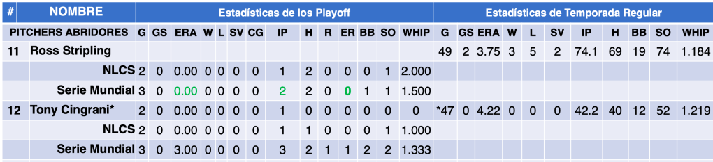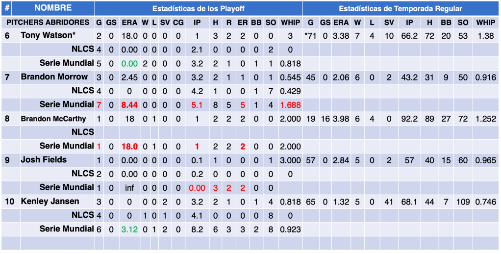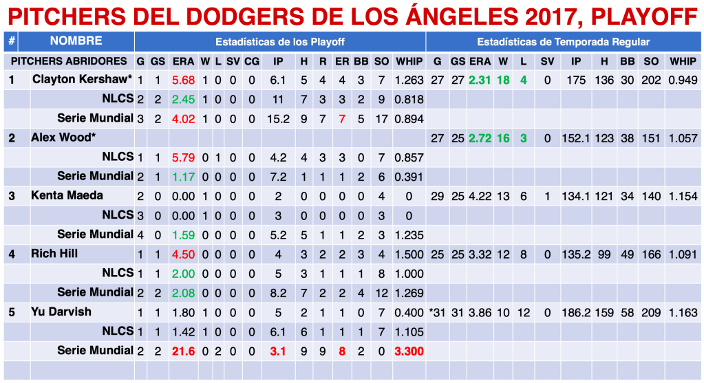 En lo tocante al departamento de picheo, en la Serie Mundial, arrojaron buenos números Kenta Maeda con 1.59 de efectividad, Rich Hill con 2.08 y Alex Wood con 1.17 de ERA, lo mismo que el relevista intermedio Tony Watson y Ross Stripling que tuvieron .000 de ERA Cingrani y Jansen no lo hicieron mal con 3.00 y 3.12 de porcentaje de carreras limpias admitidas, respectivamente, aunque Jansen falló en el juego 2, lo que podría haberle dado a Dodgers una ventaja de dos juegos a cero en la serie.
