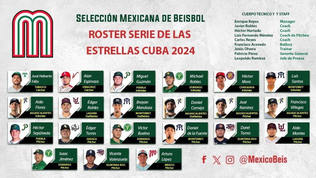 La Selección Mexicana de Beisbol participará en la Serie de las Estrellas Cuba 2024, torneo internacional que también contará con la presencia de los representativos nacionales de Venezuela, Cuba y con los Cocodrilos de Matanzas, el más reciente campeón de la Liga Elite del Beisbol Cubano.