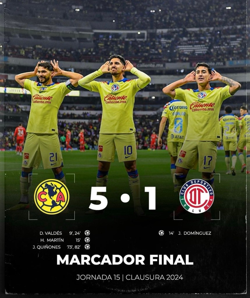 Jornada 15 América 5-1 Toluca estadio Azteca goles del América: D. Valdés 9’, 24’. H. Martin 15’. J. Quiñones 73’, 82’. Gol del Toluca: J. Domínguez 14’.