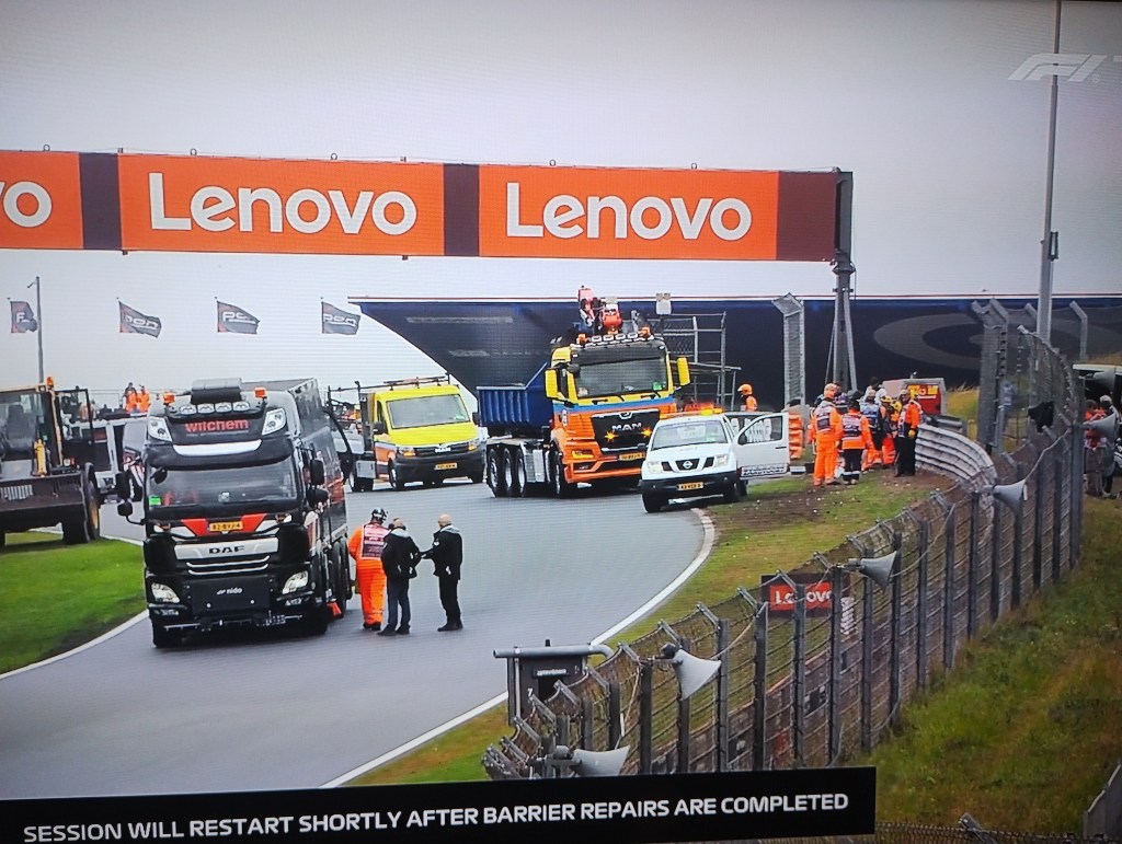 El día de hoy se llevo acabo el segundo día del gran premio de los países bajos con un accidentado inicio ya que el piloto norte americano Logan Sargeant tuvo un aparatoso accidente saliendo de la curva tres ya que después de pasar los pianos siguió por fuera y piso el pasto ocasionando que perdiera el control de carro e impactando con las barras de contención de una de las salidas de la grúas de pista.
