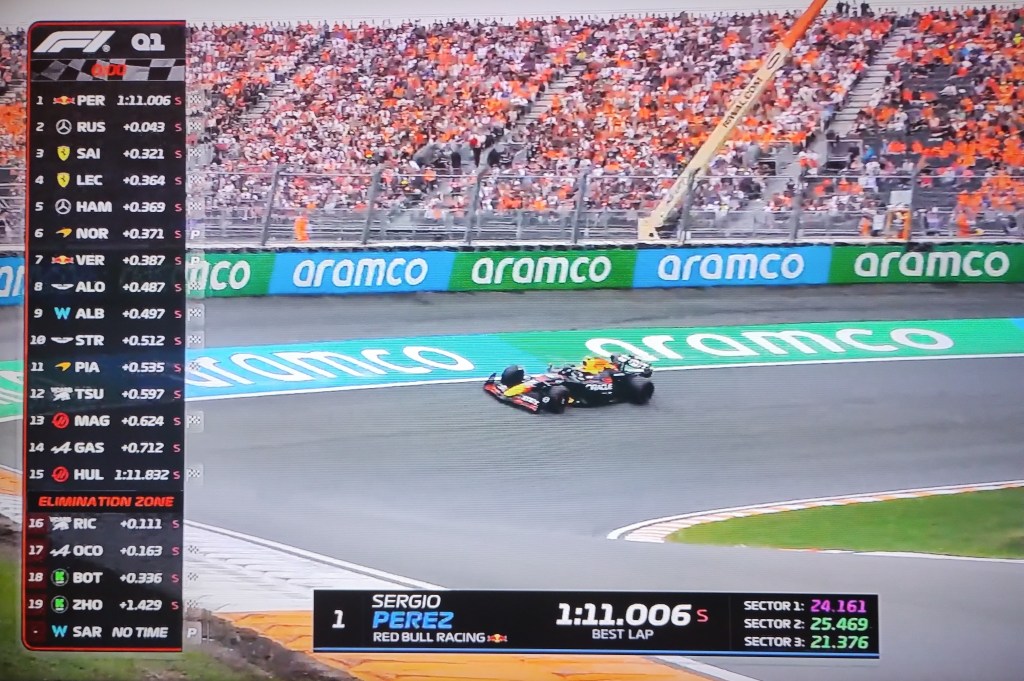 Nuestro piloto Sergio Pérez llego en el lugar 5 con un tiempo de 1:10.416 mejorando sus tiempos anteriores en la Q1 y Q2 , esto le permite tener una buena carrera por que el circuito de Zandvoort que es un circuito donde rebasar no es fácil.
