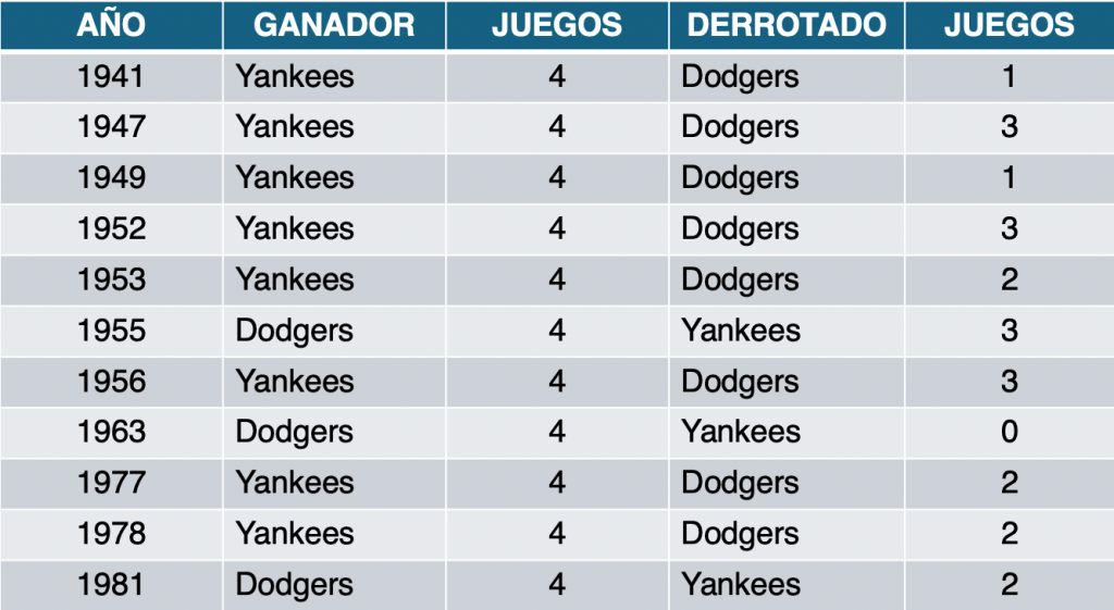 A continuación el listado de los «Clásicos de otoño» disputados entre dos de las franquicias más emblemáticas de la Major League Baseball. También son las franquicias que más se han enfrentado en Serie Mundial, la doceava edición entre éstas novenas empezará el próximo viernes a las 18:06 hs tiempo del centro de México en el Dodger Stadium.
