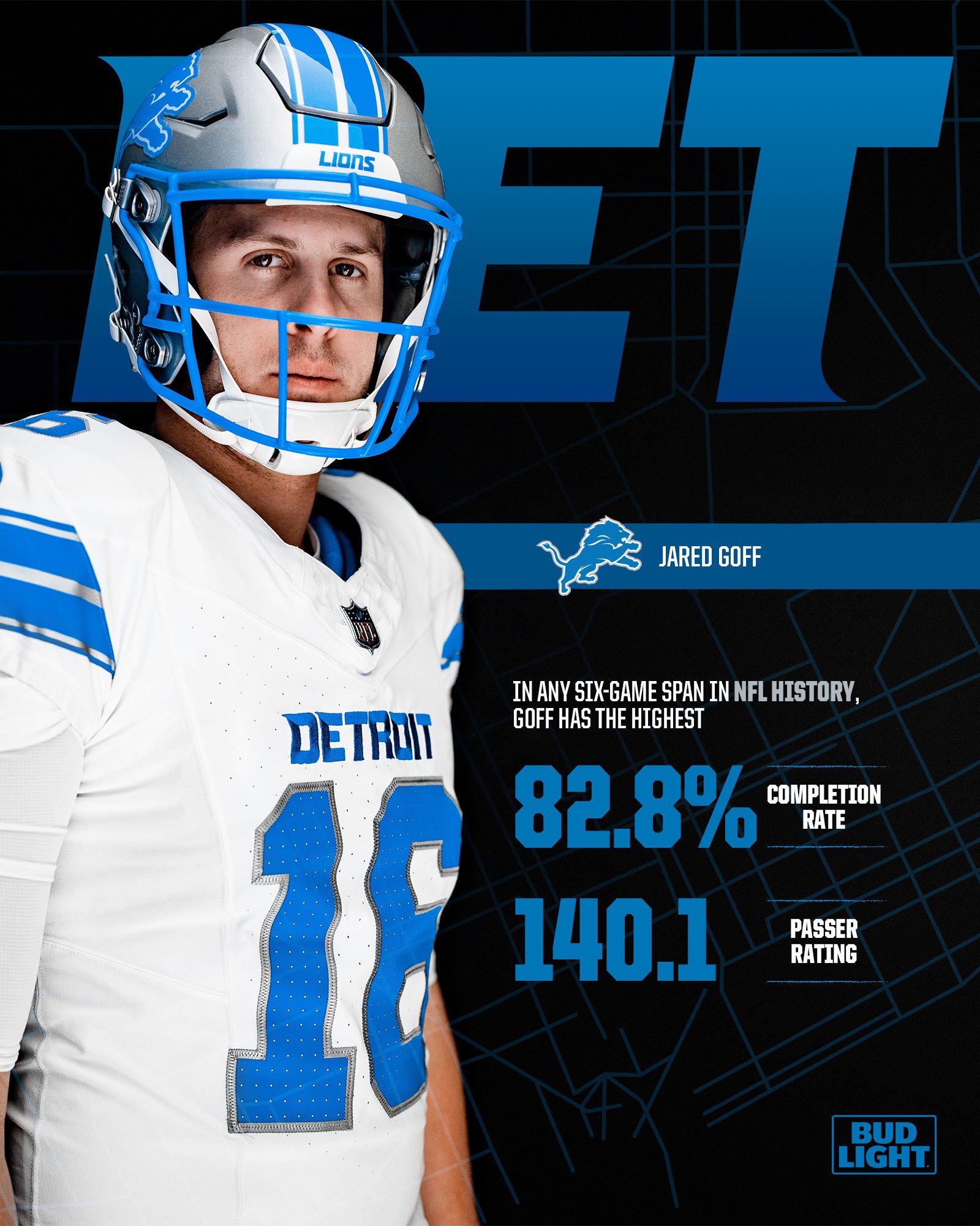 Goff tiene un índice de pasador de 140.1 en sus últimos seis juegos, superando a Brock Purdy (índice de 138.1 en 2023 con San Francisco) por el índice de pasador más alto (mínimo 100 intentos) en un lapso de seis juegos dentro de una temporada en la historia de la NFL.