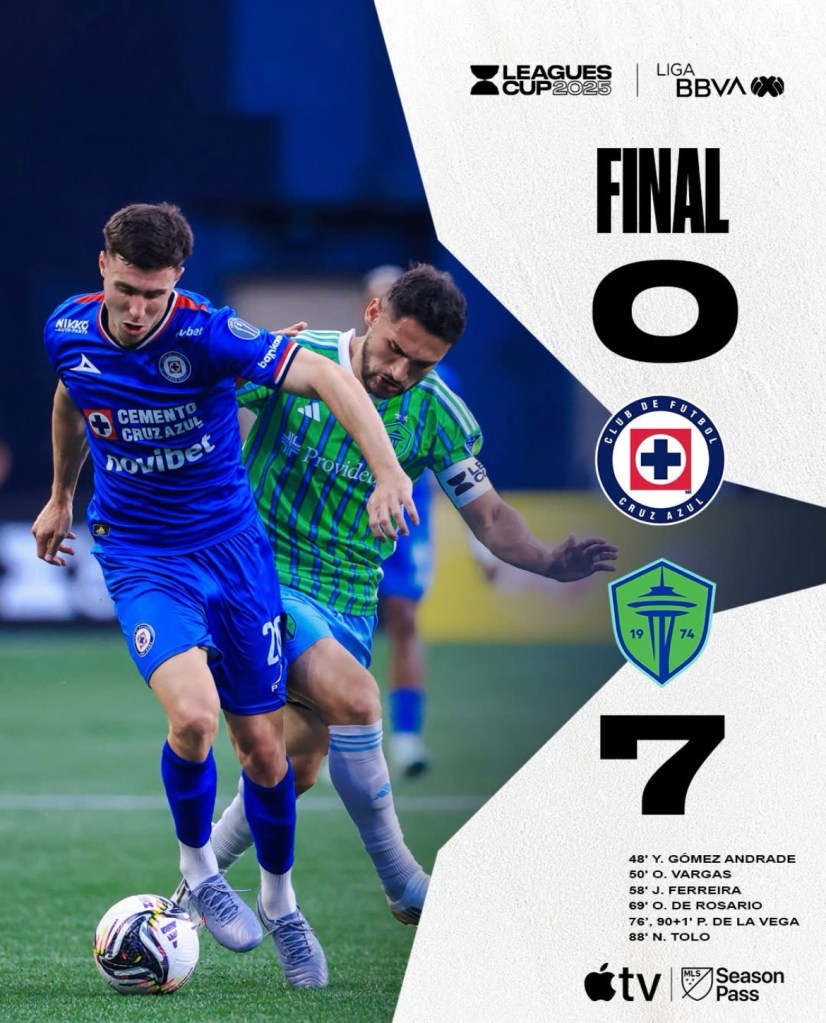 Cruz Azul fue aplastado en su primer partido ante Seattle Sounders en la Leagues Cup, tras caer de manera humillante con marcador de 7-0 en el Lumen Field. Por lo que prácticamente están eliminados de dicho certamen.