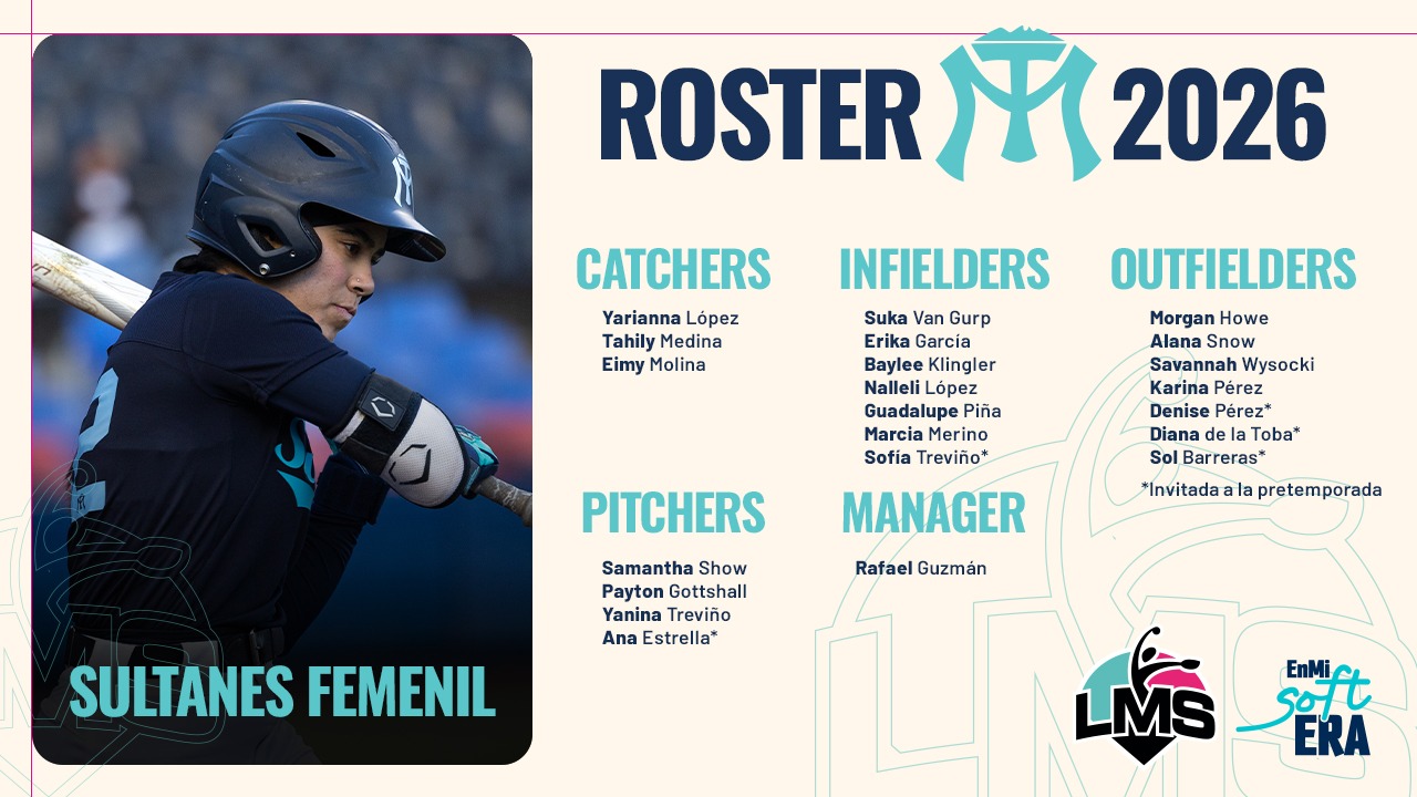 Guadalupe Piña también verá tiempo de juego en el cuadro. Jugó las dos campañas anteriores con Sultanes: bateó para .314 en nueve juegos en 2024 y en 2025 aumentó su participación a 27 encuentros y, aunque finalizó con un promedio de bateo de .221, fue la mejor bateadora de Sultanes en la postemporada con un porcentaje de bateo de .632 en siete juegos.