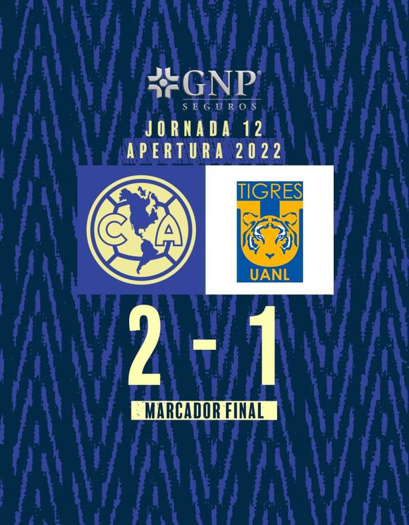 Jornada 12 Apertura 2022 América 2-1 Tigres Estadio Azteca Goles América: J. Rodríguez 1′ ,A. Zendejas 45+2. Goles Tigues: A. Gignac 9′.