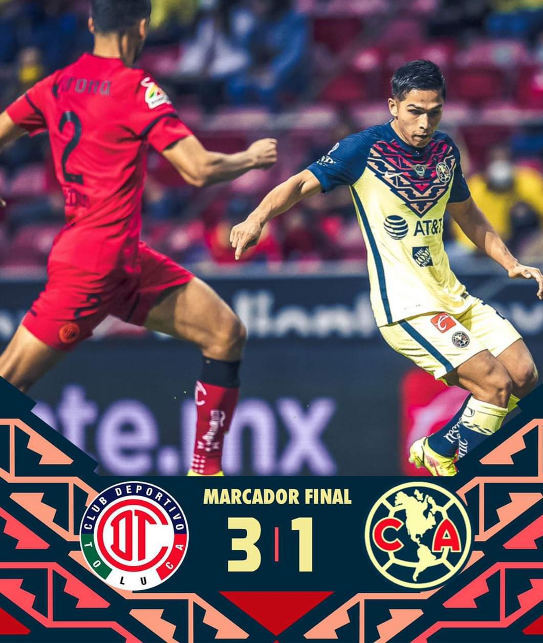 Esta noche el Club América pierde su invicto en este torneo Apertura 2021 como visitante ante su rival Toluca en el Nemesio Diez 🏟 por un marcador de 3-1 donde los encargados de marcar por parte de los Diablos fueron H. Ortega 2′, 61′ , B. Samudio 38′ mientras que por parte de las águilas el gol fue por parte de H. Martín 6′ ⚽️⚽️ también hubiera dos expulsados en el encuentro uno de cada bando por parte del Toluca C. Baeza 56′ 🟥 y del América S. Cáceres 84′ 🟥