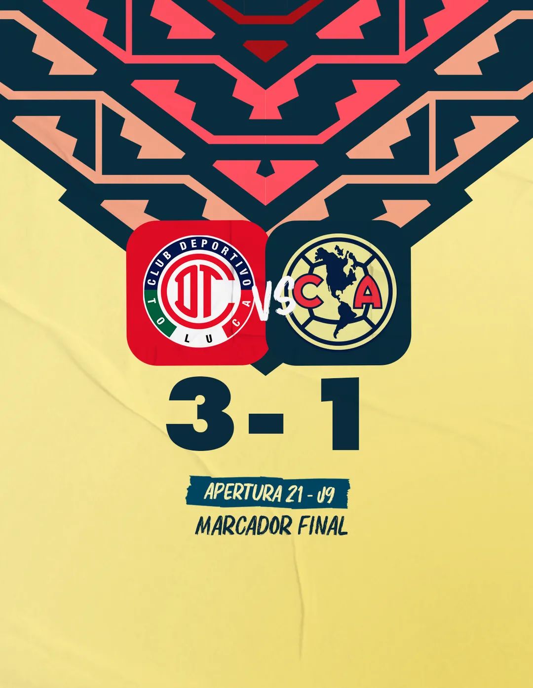En un partido donde no se le vio desplegar un buen funcionamiento a los de coapa y desde muy temprano en el partido recibieron la primera anotación por vía de su propio canterano Ortega que fue vendido al toluca y fuera el mismo quien le anotará 2 goles durante el encuentro, de igual manera el único tanto de las águilas cayó de manera inmediata por parte de su delantero Martín para en ese momento poner el empate en el marcado muy temprano aun el partido hubo varios errores y un primer tiempo malo para los de coapa., para el segundo tiempo tras la expulsión de Baeza de manera inmediata cae el tercer gol del Toluca y con eso el América se fue al frente con todo lo que tenía pero que de nada le sirvió pues ya estaba dictado el resultado que terminaría sin moverse ya, ambos porteros fueron figuras en el encuentro para que no incrementarán más el marcador y al final del partido por la expulsión de Cáceres que se marcó como penal una mano dentro del área R. Sambueza fue el encargado de cobrar la pena máxima pero no fue bueno el disparo y lo mando por un lado de la portería para asi finalizar el encuentro de esta jornada 9 y quitarle el invicto a las águilas del América 🟡🔵👑🦅
