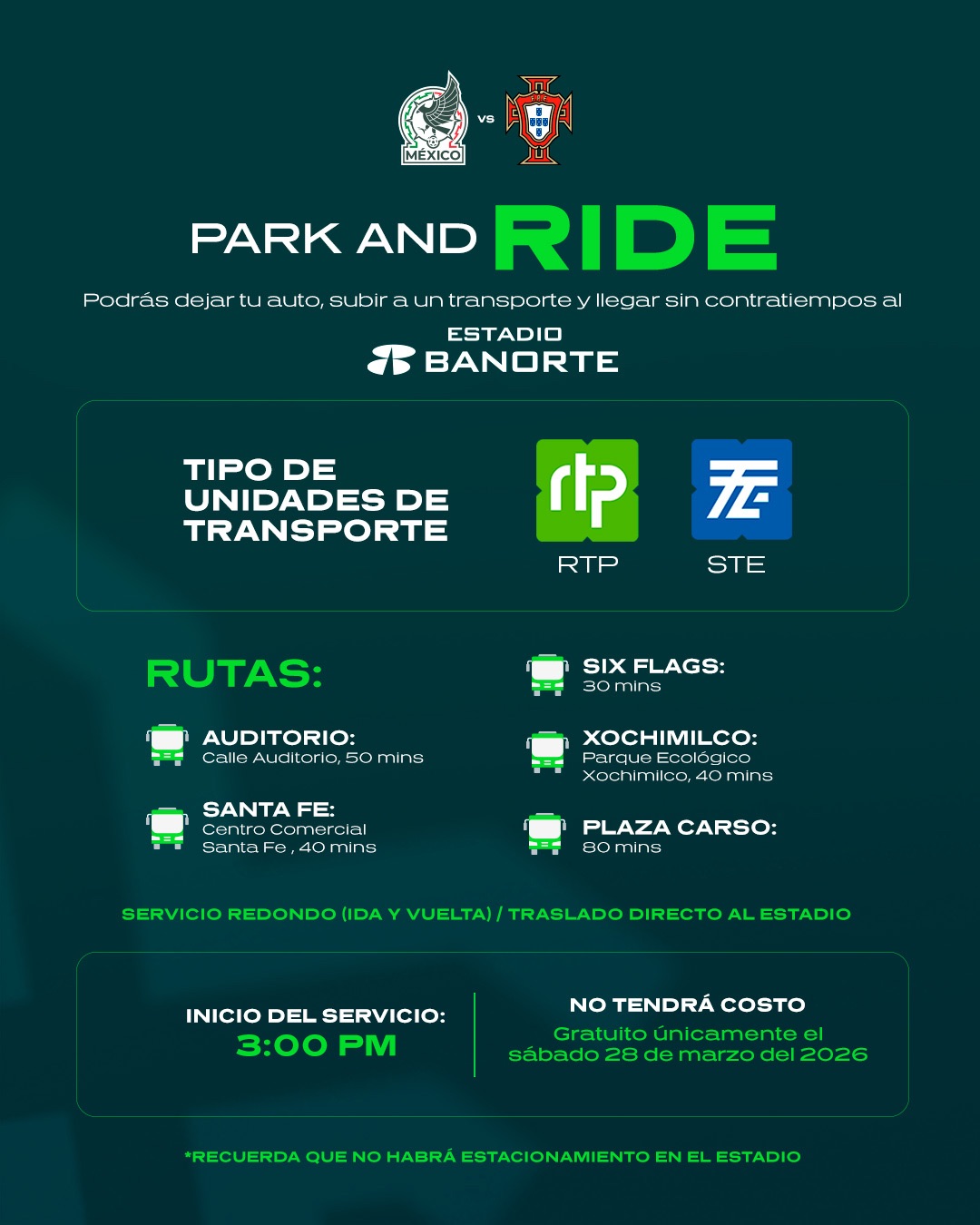 El gobierno de la Ciudad de México impondrá un sistema llamado “Park & Ride”. Consiste en estacionamientos ubicados en diferentes puntos de la capital. De esos puntos, autobuses de la Red de Transporte de Pasajeros ofrecerán un translado directo al estadio.