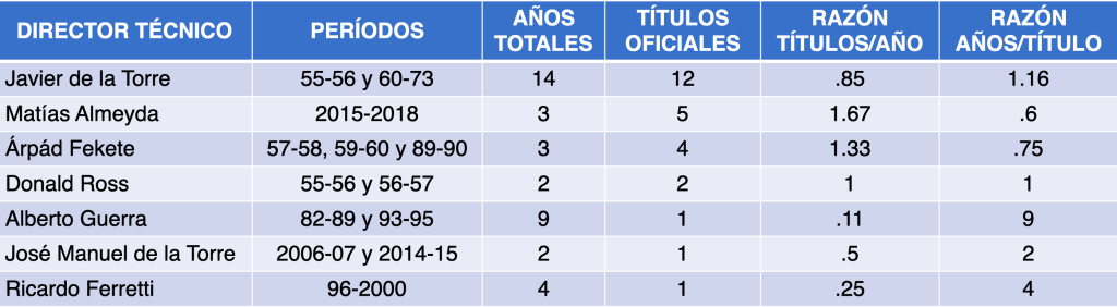 Para contratar a un Director Técnico desde luego que es importante evaluar su modelo de juego y todo lo que esto implica, pero aquí no hace falta hablar de modelos de juego, de idea de juego, de comportamientos en la cancha en las distintas fases o de sistemas o formaciones tácticas, las sensaciones que se crean si juega bonito, etc., esto lo podemos omitir por ahora porque al final del camino lo que más le interesa a un dueño, a un aficionado o a un historiador del fútbol, son los resultados, los títulos que se obtuvieron, porque es lo que te da grandeza y genera identidad.