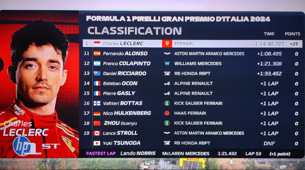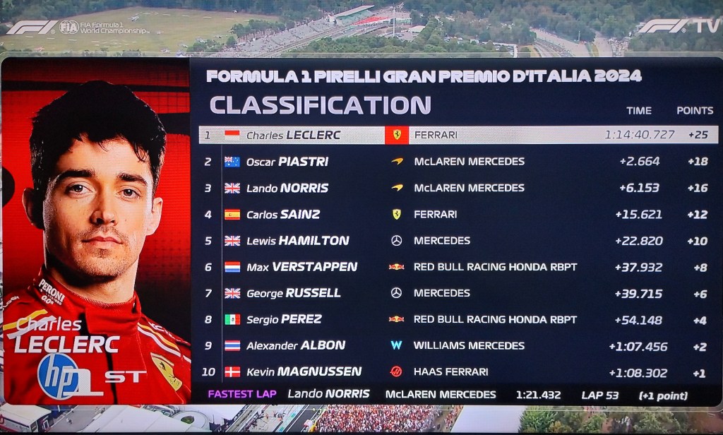 Italia está feliz por la victoria del piloto de la escudería Ferrari Charles Leclerc , fue una carrera en todo momento emocionante, tuvimos duelos de pilotos por defender y ganar posiciones, el debut ya en carrera del Argentino Franco Colapinto y la suspensión por una carrera al piloto de HAAS Kevin Magnussen.