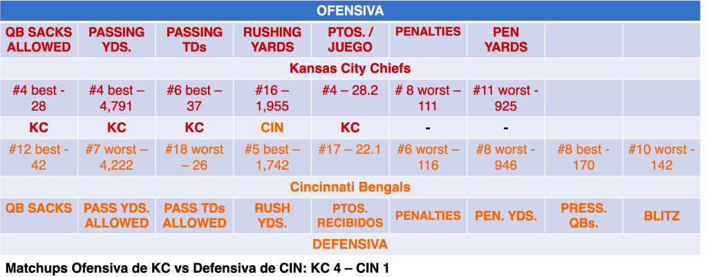 LA OFENSIVA DE LOS KANSAS CITY CHIEFS VS LA DEFENSIVA DE LOS CINCINNATI BENGALS.