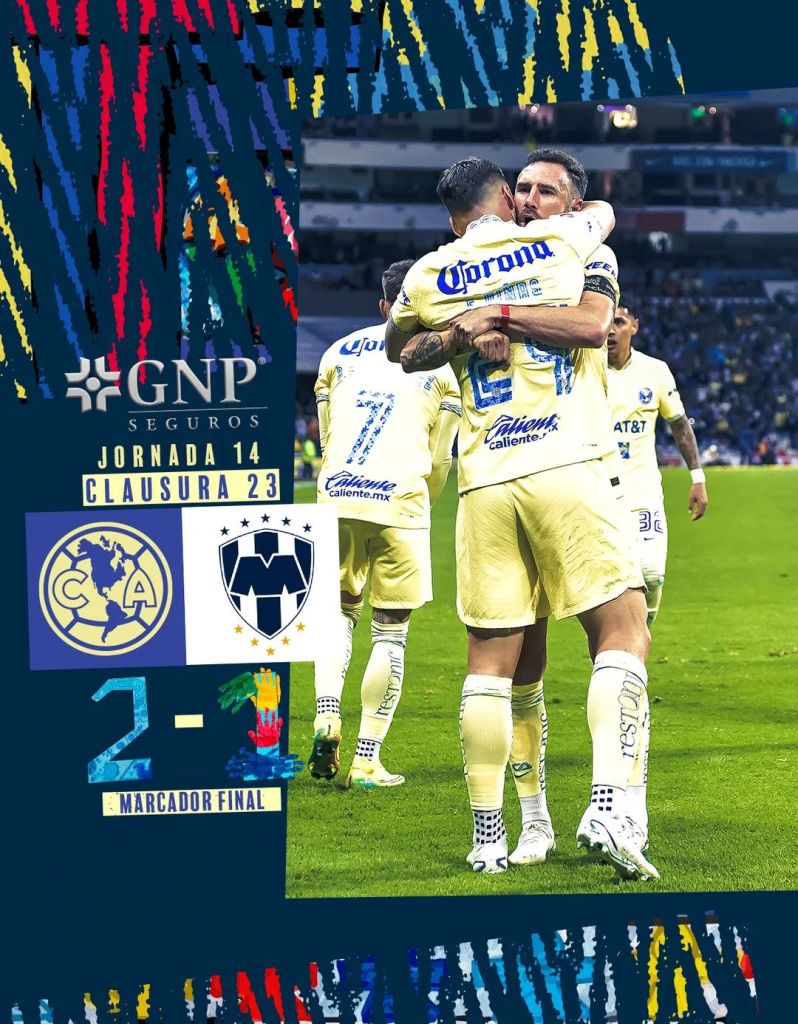 Jornada 14 Clausura 2023 Estadio Azteca América 2-1 Monterrey Goles América: D. Valdes: 36′, F. Viñas: 79′, Gol Monterrey: M. Meza 19′., Expulsión E. Andrada 90+8′.