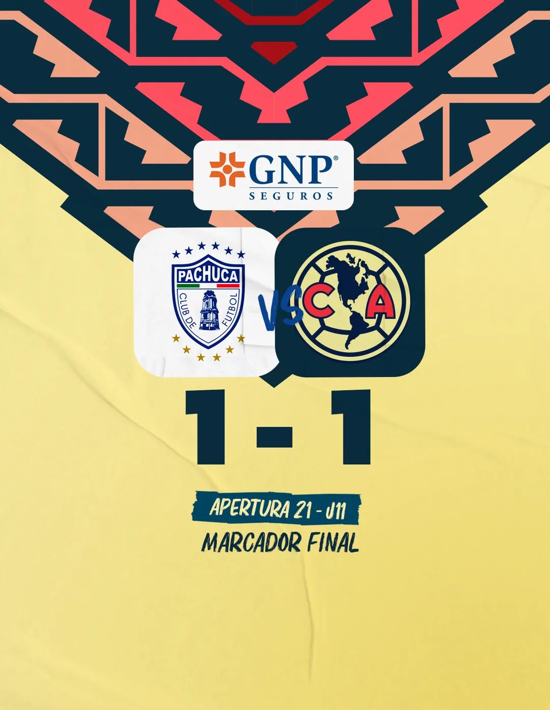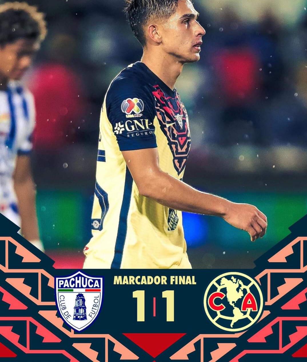 Esta noche de martes en la doble jornada numero 11 las Águilas visitaron al estadio Hidalgo 🏟 para enfrentarse a su rival en turno los tuzos del pachuca 🔵⚪ en donde igualaron el marcador a 1-1 los tuzos se adelantaron con una mala defensa en el área por parte de B. Valdez habilitando al jugador contrario y así al 33′ G. Cabral adelantaba a la escuadra del pachuca donde no estaban jugando prácticamente a nada solo mandaban pelotazos para que sus delanteros pudieran hacer algo sin embargo sin mucho resultado hasta que llegó el gol que habríais el marcador., para antes de que terminará el primer tiempo las águilas intentaron hasta que en una jugada por la banda izquierda donde Cordova mando pase a Henry y no pudo recepcionar de forma correcta el balón quedó a la deriva dentro del área grande y con un gran esfuerzo en carrera S. Reyes mando el balón al fondo recorriendo toda la banda hasta llegar al área al 45+1′ e irse empatados al medio tiempo.👑🦅🔥🏆⚽️🟡🔵