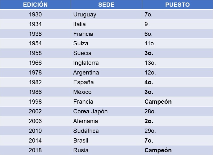 Mejor actuación: Campeón del mundo en 1998 y 2018.