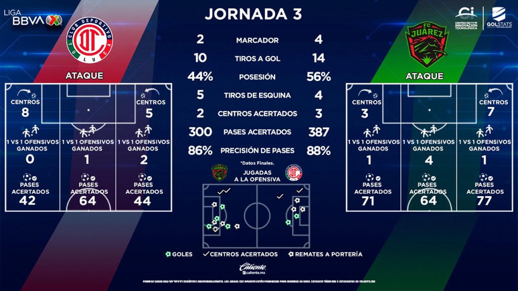 Para el minuto 77 venía Amaury Escoto para volver a tomar la delantera para los Bravos 3-2, en los siete minutos agregados por el tercero en el terreno de juego vendría Aitor García para rematar a los Diablos que perdían en casa en la semana 3 del torneo.