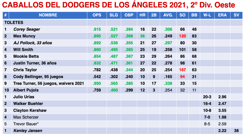 Dodgers terminó con SIETE toletes por arriba del .800 de OPS: Corey Seager, Max Muncy, A.J. Pollock, Will Smith, Mookie Betts, Justin Turner y Trea Turner; DOS de ellos por arriba del .300 de average, Seager y Trea Turner, mientra que Pollock con .297. Trea Turner, quien llegaría procedente de los Nationals  junto con Max Scherzer el 30 de julio, previo a la fecha límite de cambios, con .338 fue el “Champion Bat” de la Liga Nacional. En el pitcheo, acabaron con cuatro consistentes y fuertes abridores: Julio Urías con 20-3, Walker Buehler 16-4, Clayton Kershaw 10-8, Max Scherzer 7-0 desde que llegó al equipo, además Trevor Bauer con 8-5, quien; sin embargo, sería separado del equipo a la mitad de la temporada. Julio Urías con 20-3 fue el serpentinero con el mayor número de victorias en toda la MLB en el 2021. Todo el departamento de pitcheo de Los Ángeles terminó con 3.01 de efectividad, número uno en la Liga Nacional.
