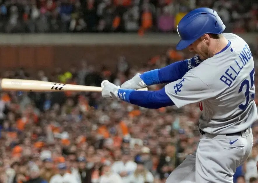 Cody Bellinger tuvo buenos números en la postemporada del 2021, aquí conecta el hit para impulsar la carrera ganadora en la novena entrada, en el quinto juego de la Serie Divisional ante Gigantes. Foto: Thearon W. Henderson / Getty Images