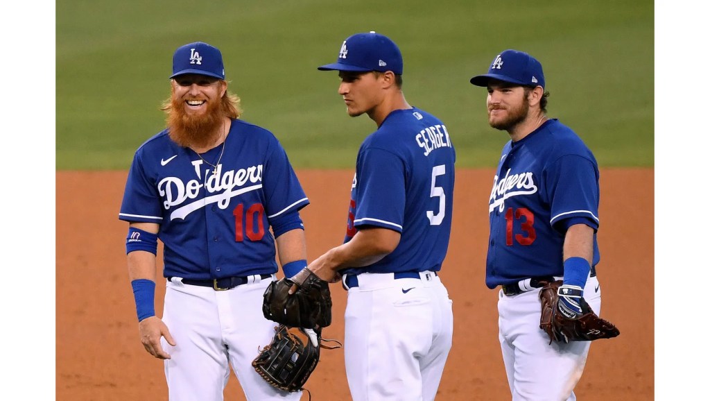 De izquierda a derecha: Justin Turner, Corey Seager y Max Muncy, tres inolvidables “Caballos” en el 2021, año en que Seager se despidió de la novena angelina. Foto: Dodgers