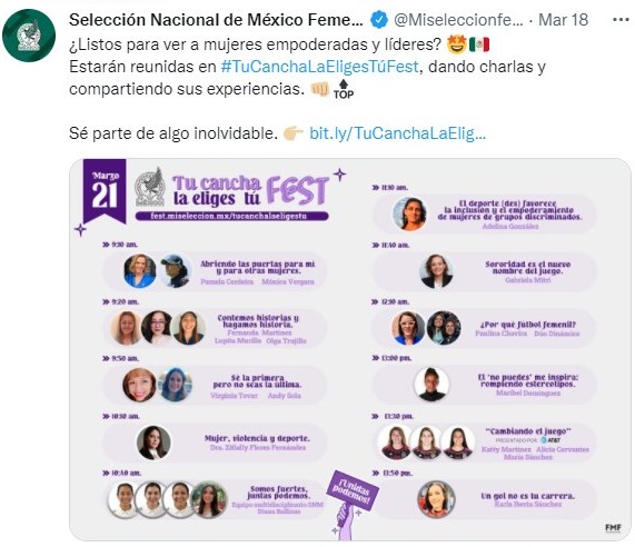 A través de sus redes sociales, la Selección Mexicana de futbol Femenil, anunció que este lunes 21 de marzo, habrá una charla virtual con algunas mujeres que han sido fundamentales para el crecimiento y fortalecimiento del futbol femenino en nuestro país.